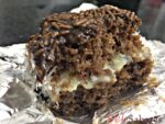 Nossos pedaços têm aproximadamente 4,5cm x 4,5cm com variações de altura entre a massa de chocolate e a branca. São bem molhadinhos e enrolados em papel alumínio. Muito bom e prático!